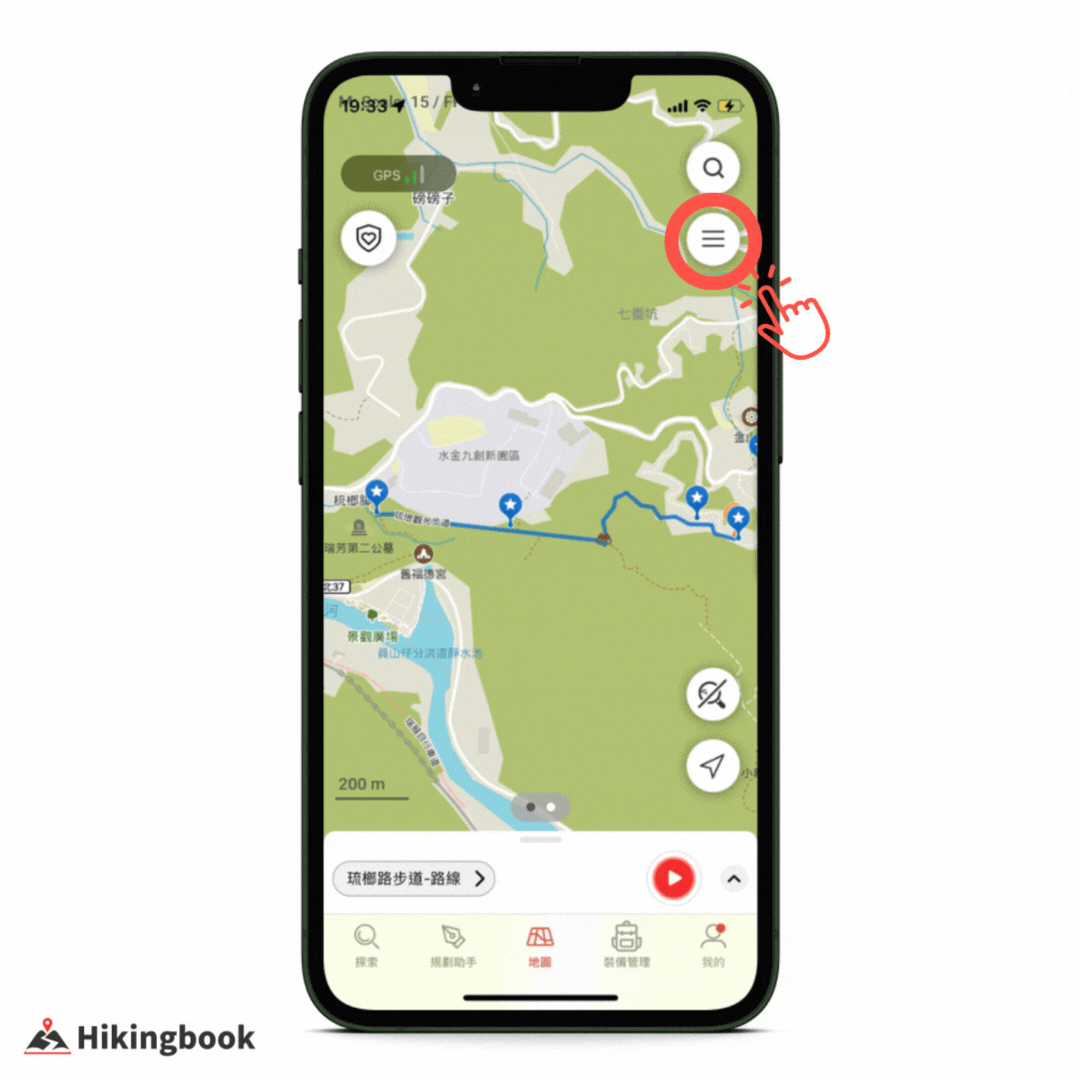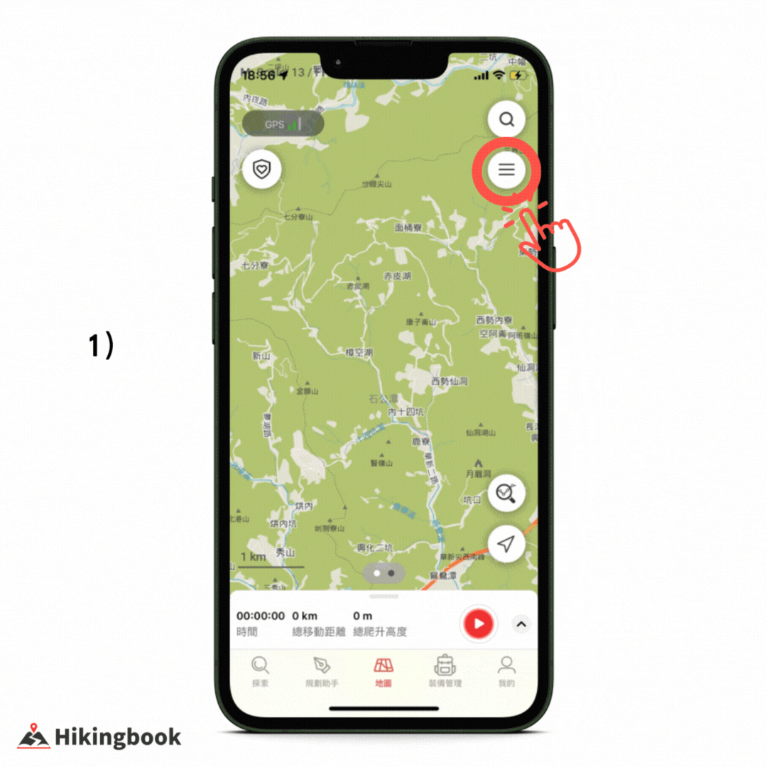 1) 手機開啟 Hikingbook ,選擇「地圖」頁籤。