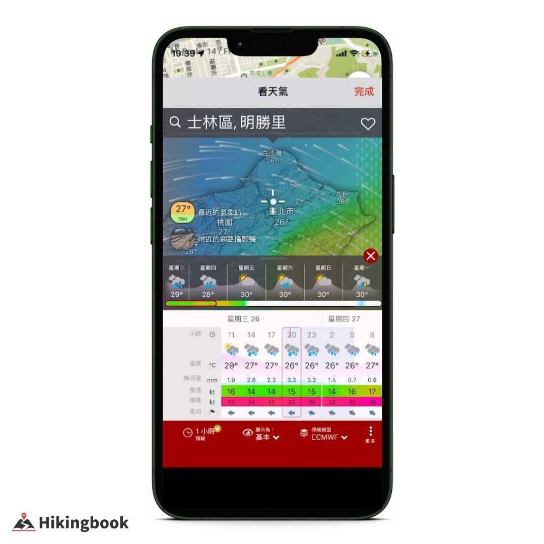 使用 Hikingbook,不必再搜尋氣象局網頁,或是下載天氣軟體,只要按下「看天氣」按鈕,就能在 APP 內確認登山區域的天氣狀況。